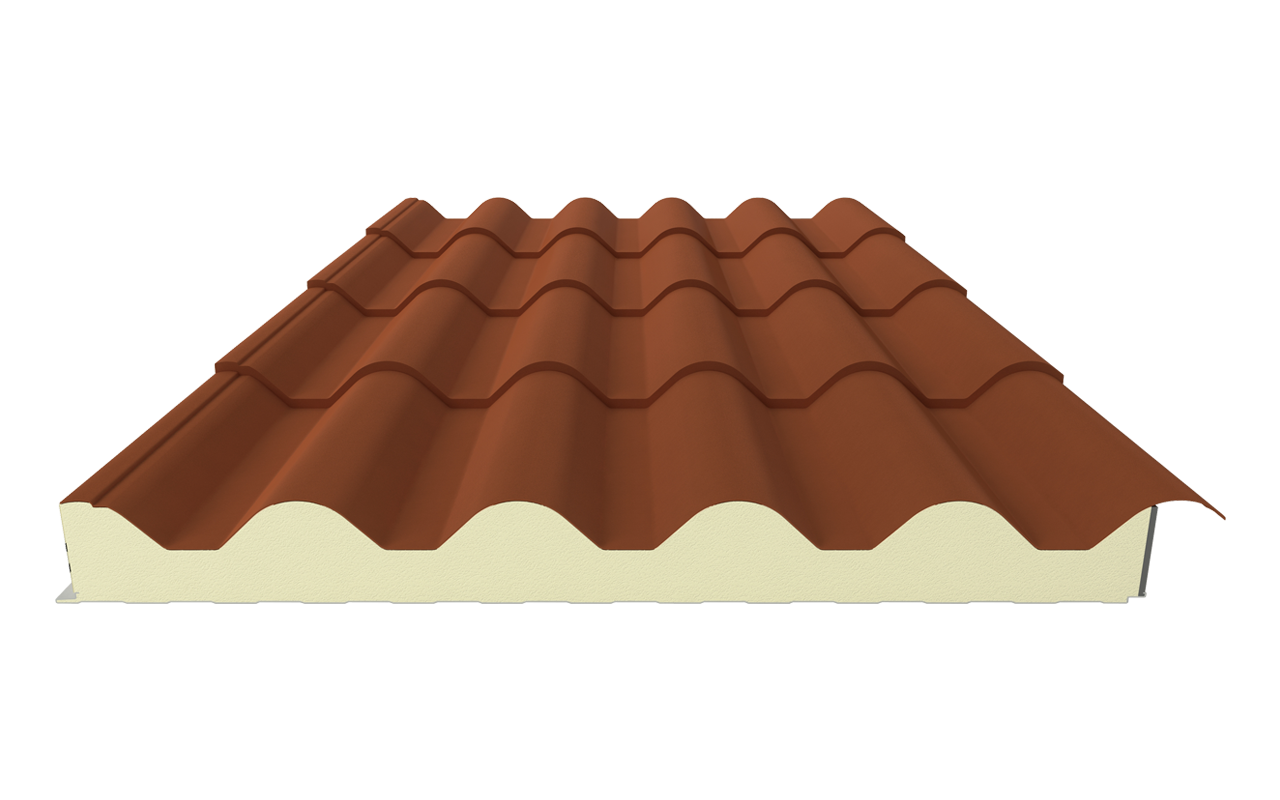 Formado por un exterior metálico que soporta diferentes acabados simulando diferentes colores de teja en su capa superior, dejando la inferior en acero galvanizado prelacado blanco. El interior de poliuretano expandido, permite garantizar un buen aislamiento térmico.